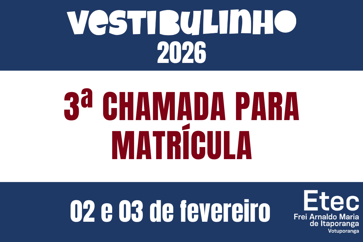 A convocação para esta chamada e realização da matrícula será válida de 02/02 até o dia 03/02/2026 e será enviada através do e-mail cadastrado na Inscrição, bem como disponível para consulta no site ou na secretaria da Etec.