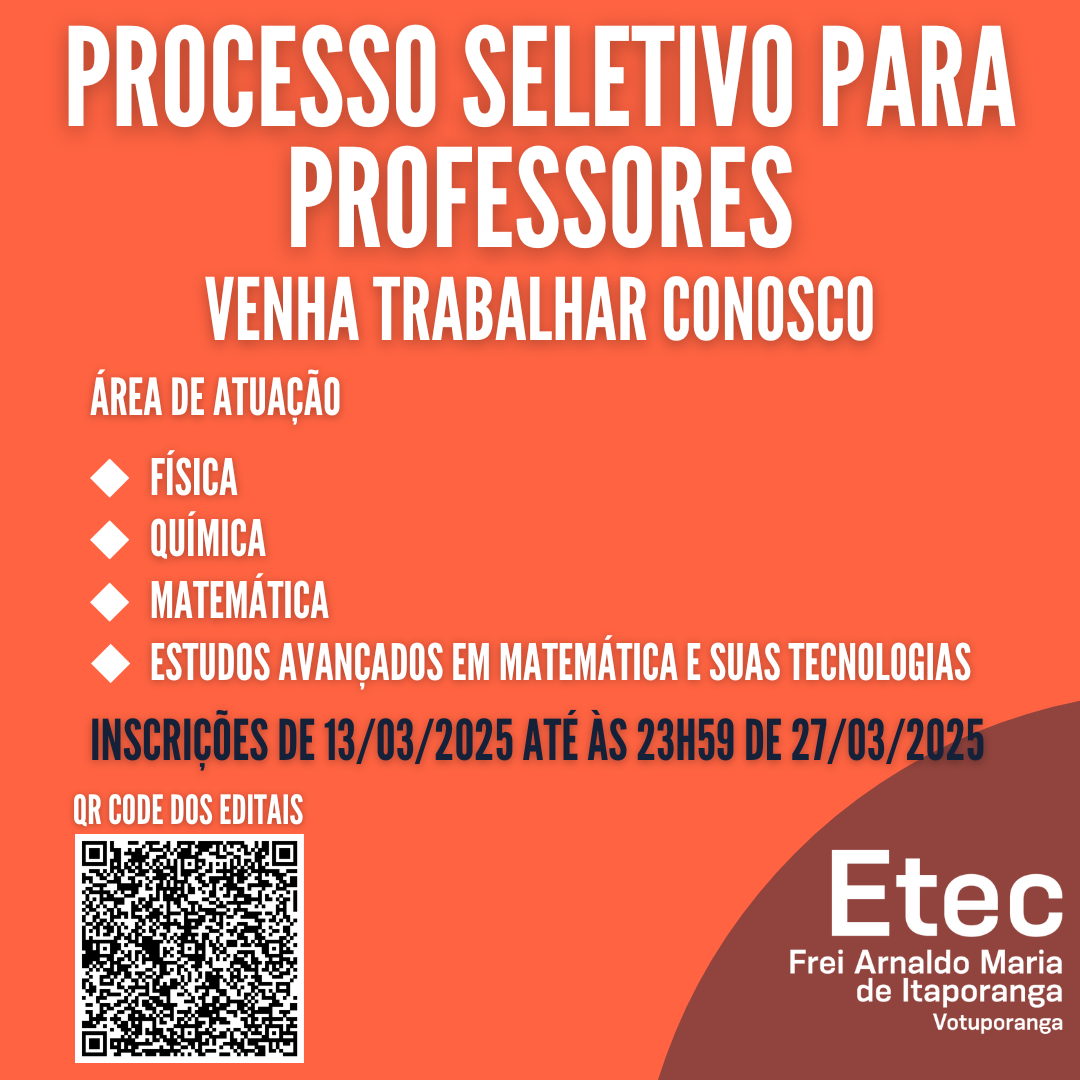 Está disponível o edital de abertura de inscrição do Processo Seletivo Simplificado para Professor de Ensino Médio e Técnico, objetivando a formação de cadastro de docentes para a função de professor de ensino médio e técnico de excepcional interesse público para os componentes curriculares de Física, Química, Matemática e Estudos Avançados em Matemática e suas Tecnologias.
