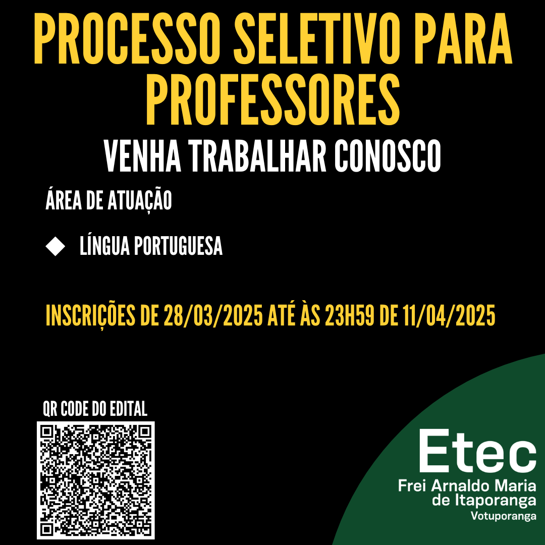 Está disponível o edital de abertura de inscrição do Processo Seletivo Simplificado para Professor de Ensino Médio e Técnico, objetivando a formação de cadastro de docentes para a função de professor de ensino médio e técnico de excepcional interesse público para o componente curricular de Língua Portuguesa.