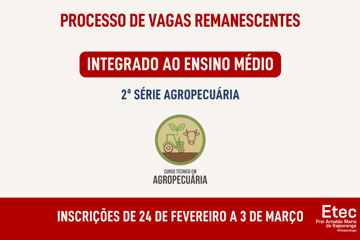 As inscrições deverão ser realizadas presencialmente na secretaria das nossa unidade rural de 24 de fevereiro à 03 de março de 2026 como segue o edital abaixo.