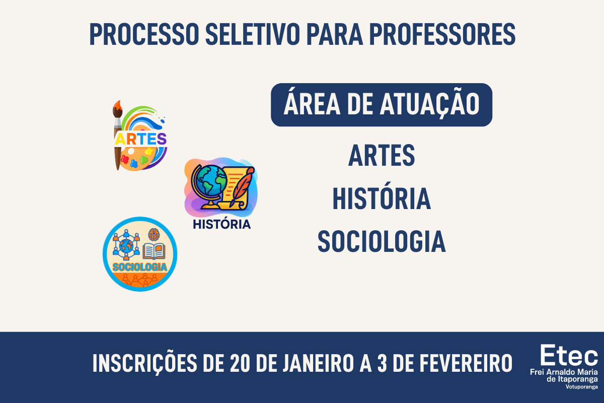 Processo Seletivo Simplificado para Professor de Ensino Médio e Técnico de Artes, História e Sociologia.
