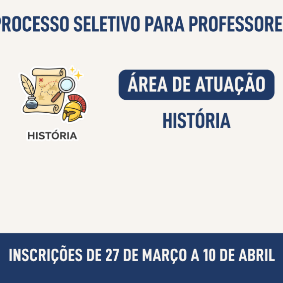 Está disponível o edital de abertura de inscrição do Processo Seletivo Simplificado para Professor de Ensino Médio e Técnico, objetivando a formação de cadastro de docentes para a função de professor de ensino médio e técnico de excepcional interesse público no componente curricular de História.